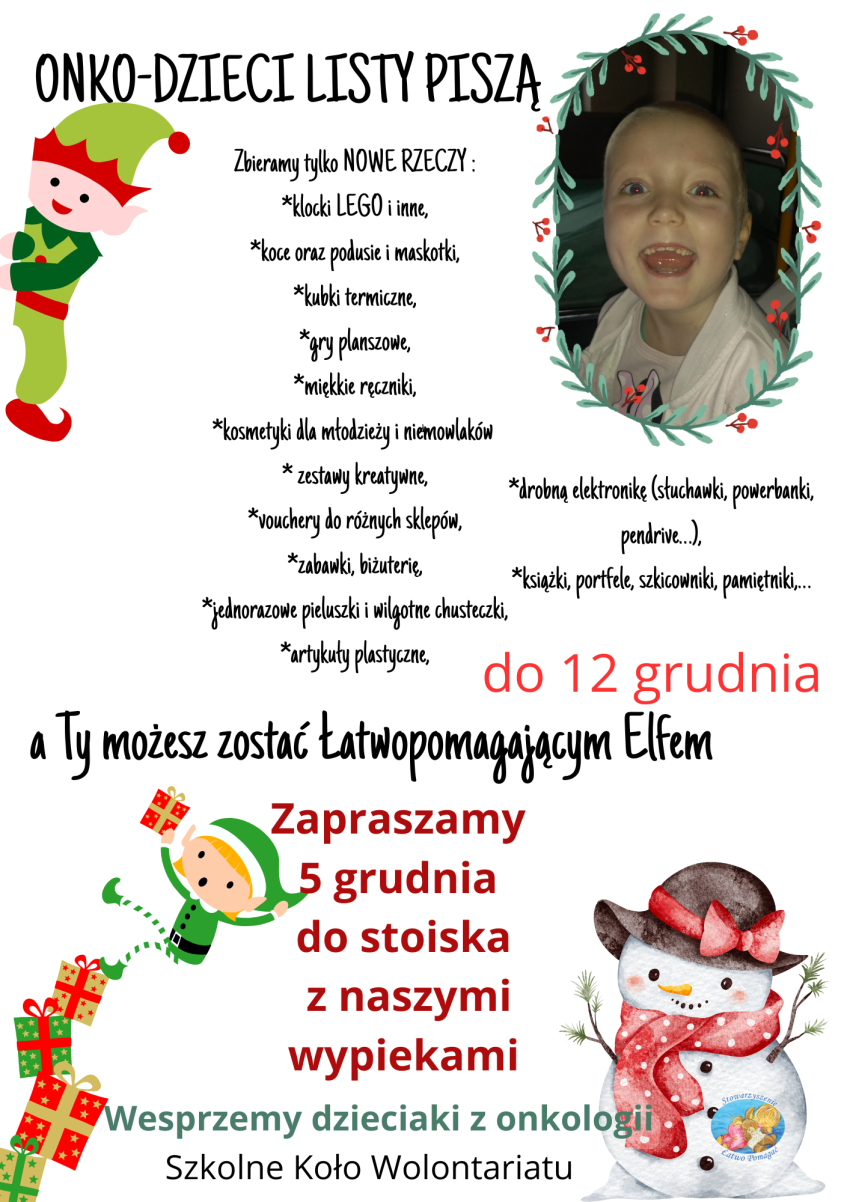 Onko-dzieci listy piszą Szkolne Koło Wolontariatu serdecznie zaprasza na akcję charytatywną na rzecz małych pacjentów z onkologii. Zapraszamy 5 grudnia na nasze słodkie wypieki. Przygotujemy również na warsztatach piękne bransoletki, które będzie można zakupić podczas akcji. Zachęcamy również do zbiórki darów dla pacjentów onkologii. Zbieramy: maskotki -sensoryczne zabawki dla najmłodszych-klocki Lego – ci mali i…