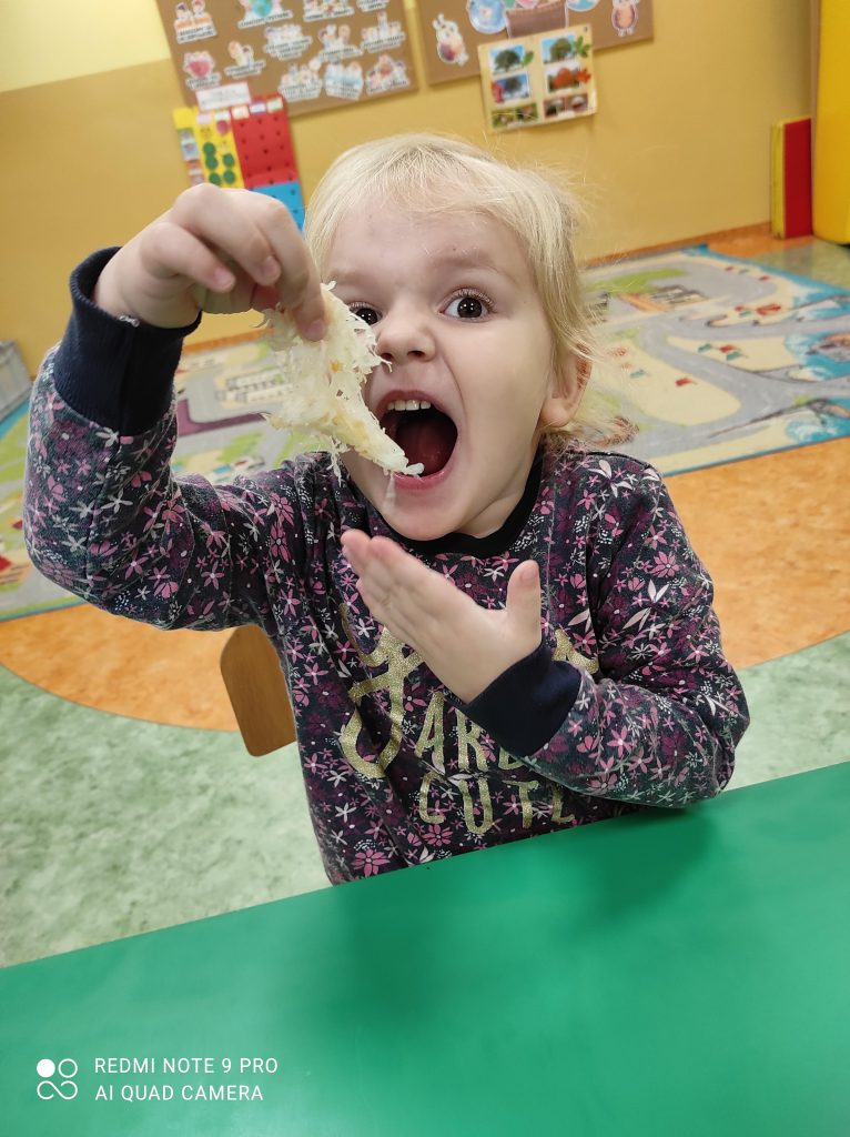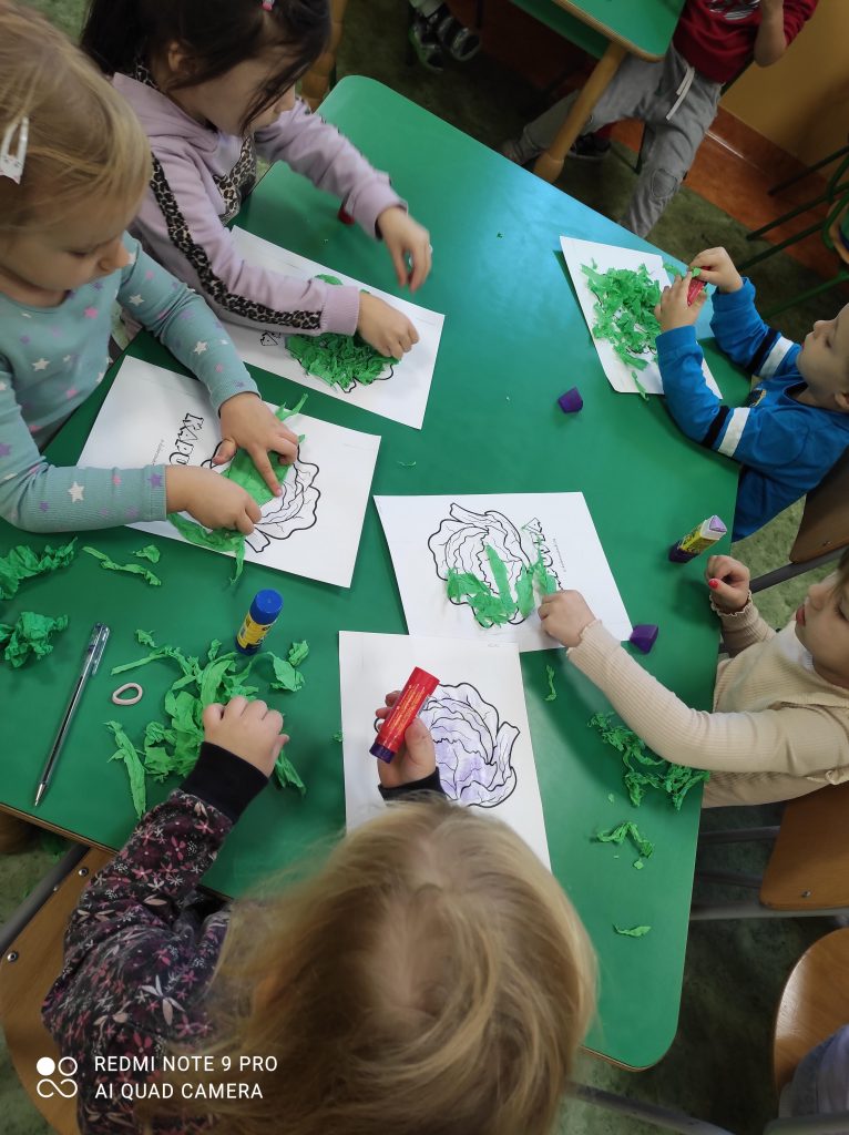 W październiku dzieci poznały historię kapusty Kamy i właściwości zdrowotne tego warzywa, a także poznały etapy kiszenia kapusty. Dzieci używały zmysłu węchu oraz smaku degustując kapustę kiszoną i określając jej smak. Przedszkolaki poznały również nową zabawę: „Ciuciubabka”, imitowały kiszenie kapusty w tunelu sensorycznym, a na koniec dnia zrobiły pracę plastyczną.