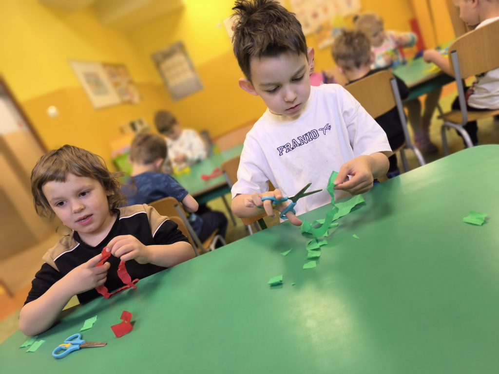 Przedszkolaki wykonały bardzo starannie pierwsze zadanie, które nazywane jest również wyplatanką. To jedna z technik prac twórczych zaproponowanych przez Froebla. Aktywność polega na tworzeniu kompozycji z kolorowych pasków, które przeplatane są przez sztywną podkładkę.