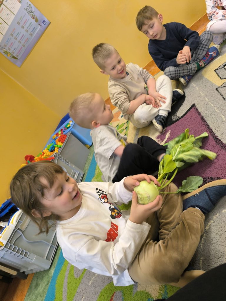 Zabawa rozpoczęła się w kole, zadaniem dzieci było przekazywanie sobie kalarepy podczas słuchania utworu: „Kalarepa Klara”, przedszkolaki poznawały w ten sposób fakturę warzywa, a także jego zapach. Następnie dzieci bawiły się w zabawę orientacyjno-porządkową: „Kalarepa jest w kolorze”, ich zadaniem było dotknąć przedmiotu, wymienionego przez nauczyciela w zabawie. Kolejnym etapem realizacji warzywnego wyzwania była zabawa kreatywna – „Kalarepowa rewia mody”, zadanie plastyczne przyniosło dzieciom mnóstwo radości. Na zakończenie grupa Biedronek zrobiła masaż relaksacyjny: „Kalarepa”.