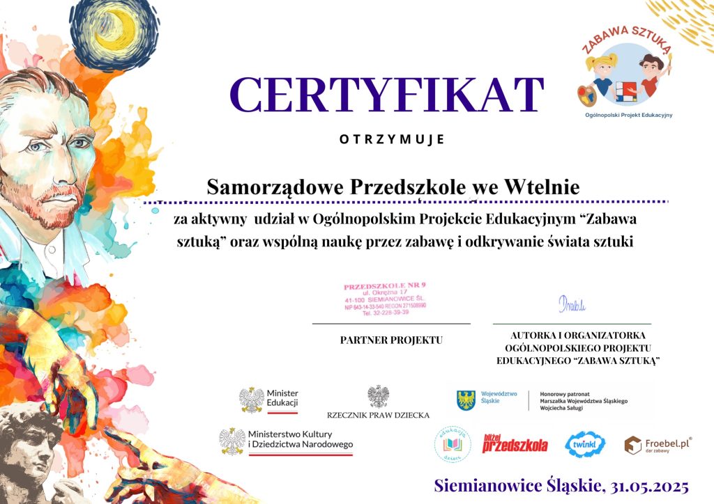 Dzieci z grupy Wiewióreczki w roku szkolnym 2024/2025 wzięły udział w Ogólnopolskim Projekcie Edukacyjnym pt. ,,Zabawa sztuką”. Głównym jego celem jest propagowanie sztuki w korelacji z kompetencjami kluczowymi oraz zgodnie z założeniami pedagogiki freblowskiej. W ramach projektu dzieci zrealizowały osiem zadań projektowych. Wszystkie zrealizowane zadania sprawiły dzieciom ogromną radość, dzięki którym miały okazję rozwinąć twórcze myślenie i kreatywność, a przede wszystkim mogły odkryć i rozwinąć swoje zdolności plastyczne. Przedszkolaki zapoznały się z różnorodnymi technikami plastycznymi oraz poznały wybrane dzieła sztuki i ich autorów. Podsumowując, projekt „Zabawa sztuką” okazał się wielkim sukcesem, ponieważ dzieci mogły poczuć się jak prawdziwi artyści.