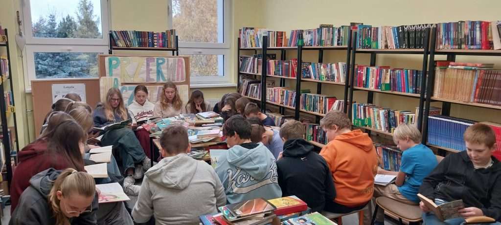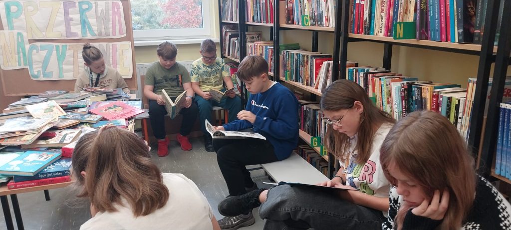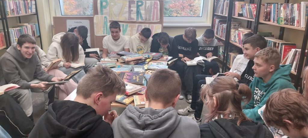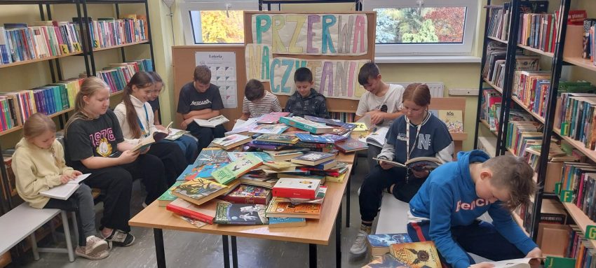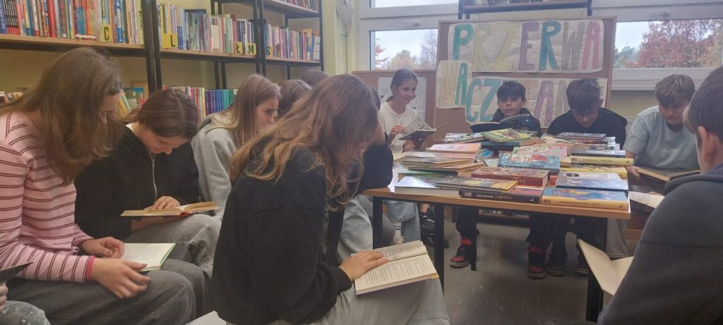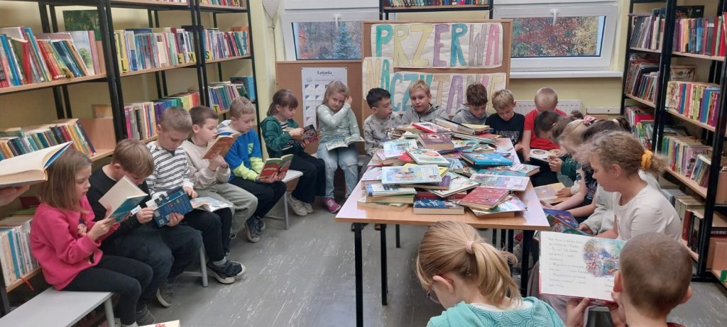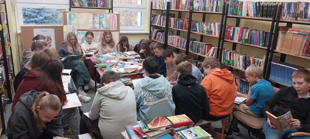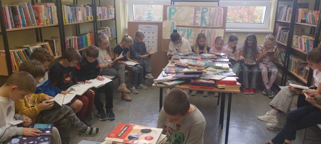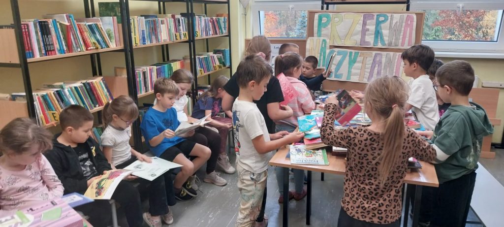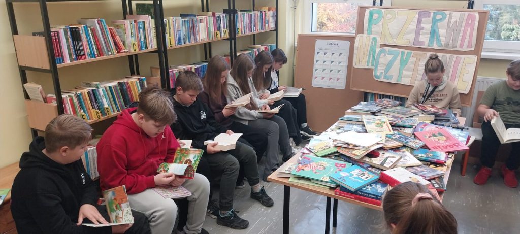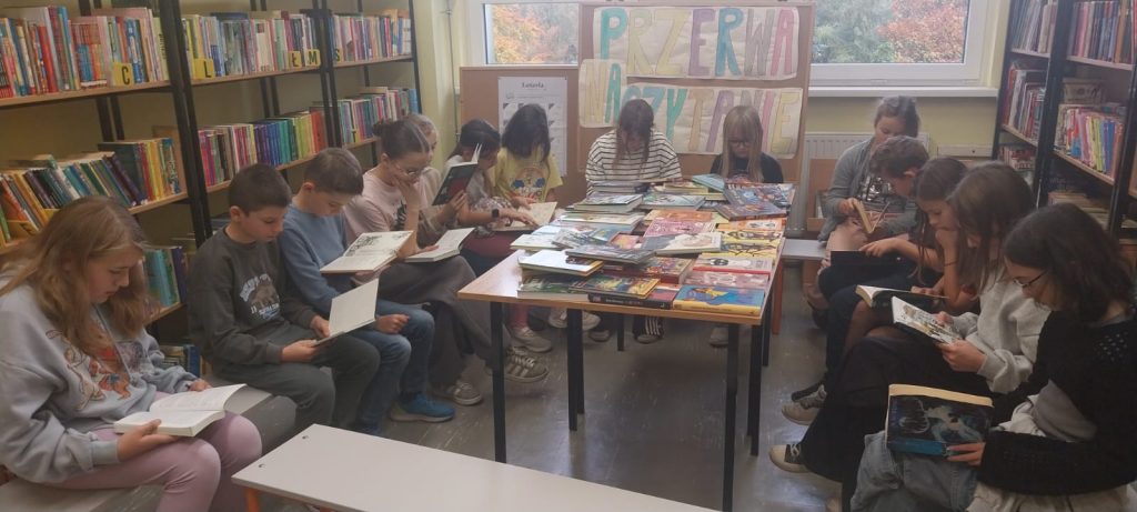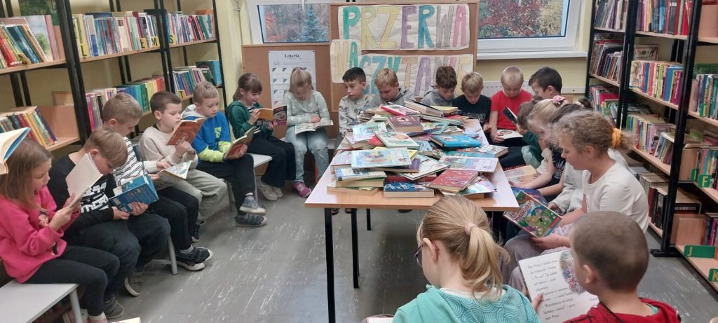 W ostatnim tygodniu października wszyscy uczniowie naszej szkoły zostali zaproszeni do biblioteki na „Przerwę na czytanie”. Oderwali się od lekcji, by w skupieniu na kilka chwil przenieść się w świat wybranych przez siebie książek. Do rąk czytelników trafiły książki przygodowe i detektywistyczne, książki o samochodach i maszynach gospodarskich, o przyjaźni i miłości – dla każdego coś ciekawego! Celem akcji była, oczywiście, promocja czytelnictwa oraz zachęcanie do korzystania z oferty biblioteki szkolnej. Wynikiem kilkuminutowego czytania były dziesiątki wypożyczonych książek. „Przerwa na czytanie” była jednym z akcentów Międzynarodowego Miesiąca Bibliotek Szkolnych, który w tym roku odbywał się pod hasłem „Biblioteka zaprasza człowieka”.