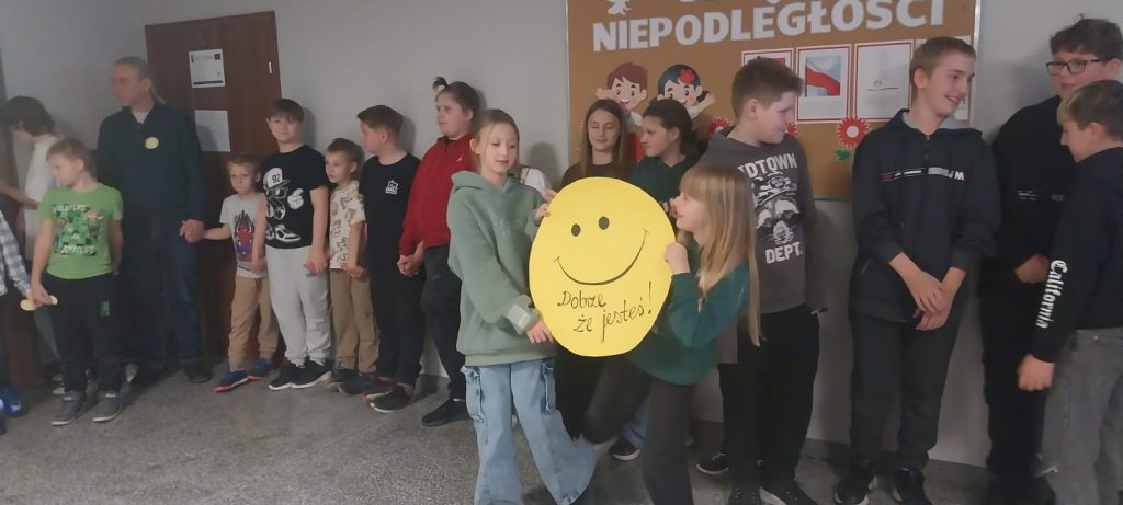Światowy Dzień Życzliwości i Pozdrowień obchodzony 21 listopada był inspiracją do przeprowadzenia w naszej szkole akcji przypominającej o tym, że słowa mają moc. Uśmiech, życzliwość, dobre słowa pomagają zmieniać życie na lepsze. Uczennice z Samorządu propagowały świętowanie tego dnia, wręczając uczniom i nauczycielom karteczki z wizerunkiem uśmiechniętej buźki. Zaprosiły wszystkich do wzięcia udziału w mini happeningu pod hasłem „Dobrze, że jesteś” mającym na celu budowanie wspólnoty społeczności szkolnej.